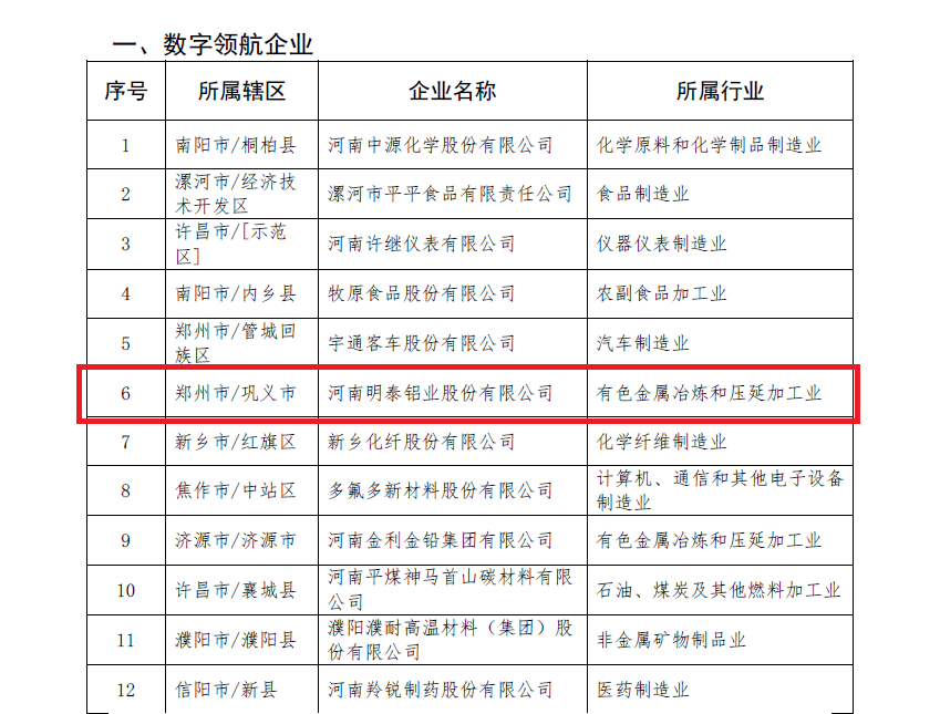 近日,河南省工業(yè)和信息化廳對擬入選2024年度河南省數(shù)字領(lǐng)航企業(yè)、中小企業(yè)數(shù)字化轉(zhuǎn)型標桿名單進行公示,河南明泰鋁業(yè)股份有限公司成功入選2024年河南省數(shù)字領(lǐng)航企業(yè),子公司河南明晟新材料科技有限公司、河南泰鴻新材料有限公司入選中小企業(yè)數(shù)字化轉(zhuǎn)型標桿名單,公司數(shù)字化轉(zhuǎn)型成果再獲權(quán)威認可。